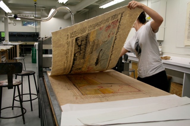 DW: A little bit, but only from a printmaking perspective with chine collé, etc…nothing like the Lokta (20×30 inches $4.00/sheet and a 3 x6 feet natural lokta @ $30.00/sheet ) or Pang Pi (45×80 inches $20.00/sheet), I like to use for my work.