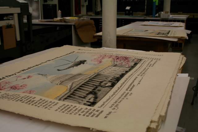 DW: I am a printer and printmaker, and run my own letterpress print shop, DWRI Letterpress in Providence, RI. The shop does commercial letterpress work, from invitations to business stationery to many, many collaborations with artists and designers. In my own prints, I make work from various sources, (found printed objects, photographs, type, etc) with ink and paper using way too many cast iron printing presses. My own work involves a lot of type, coarse halftone images, old newspapers, etc., to bring these earlier printed objects back into the mainstream.