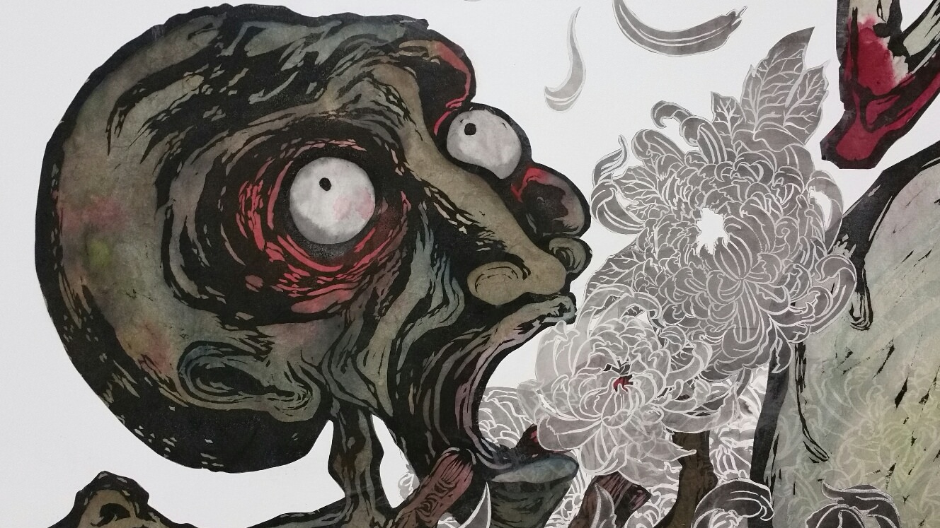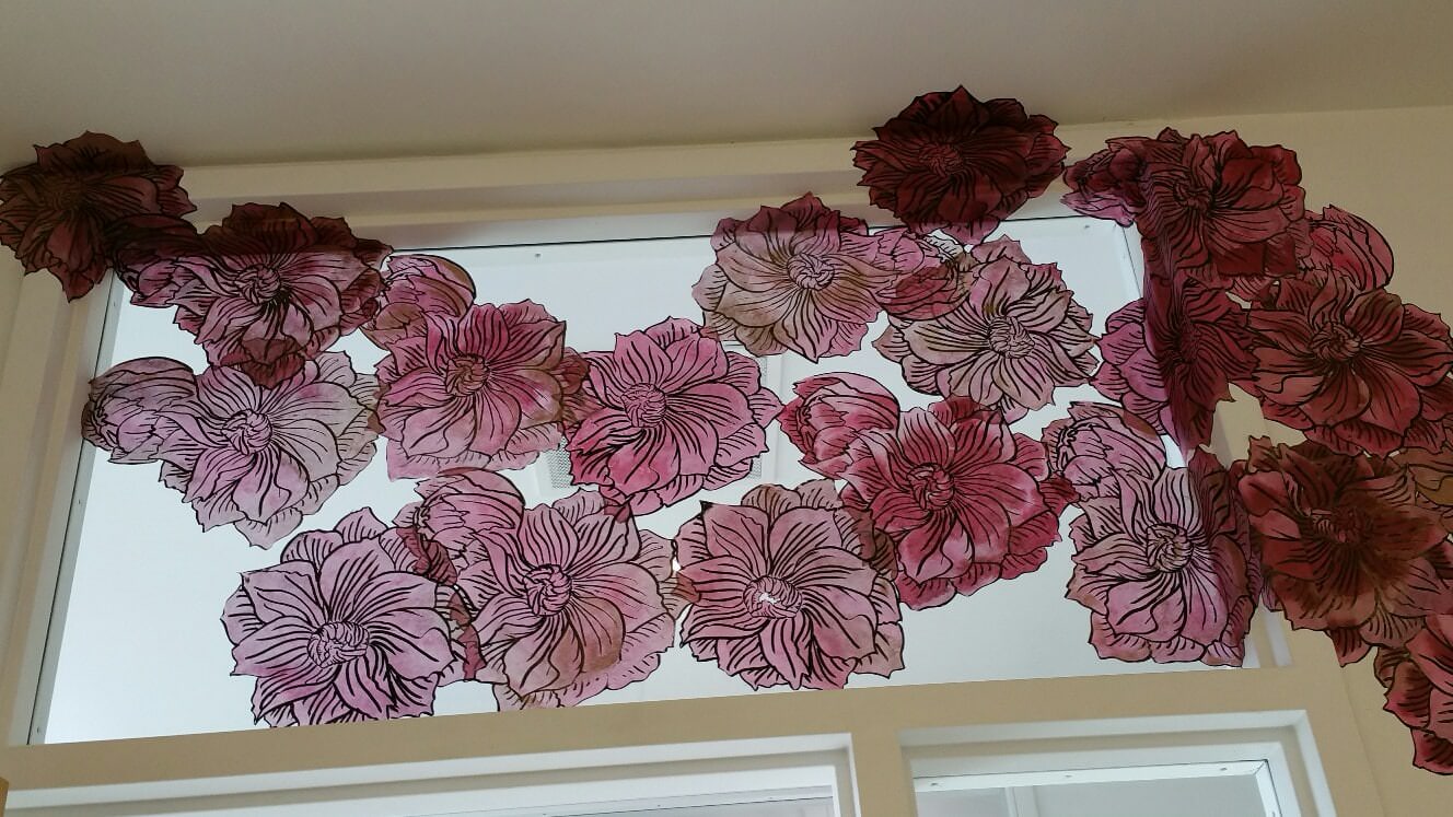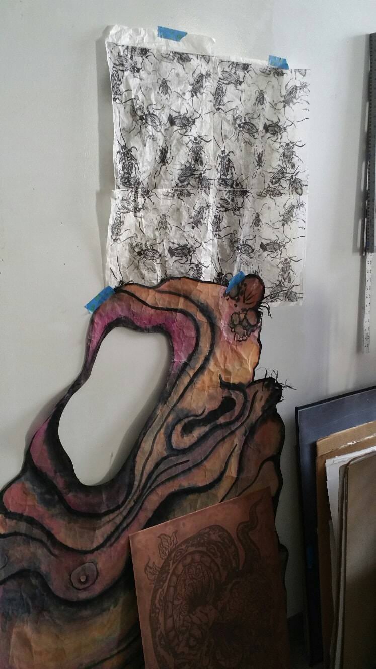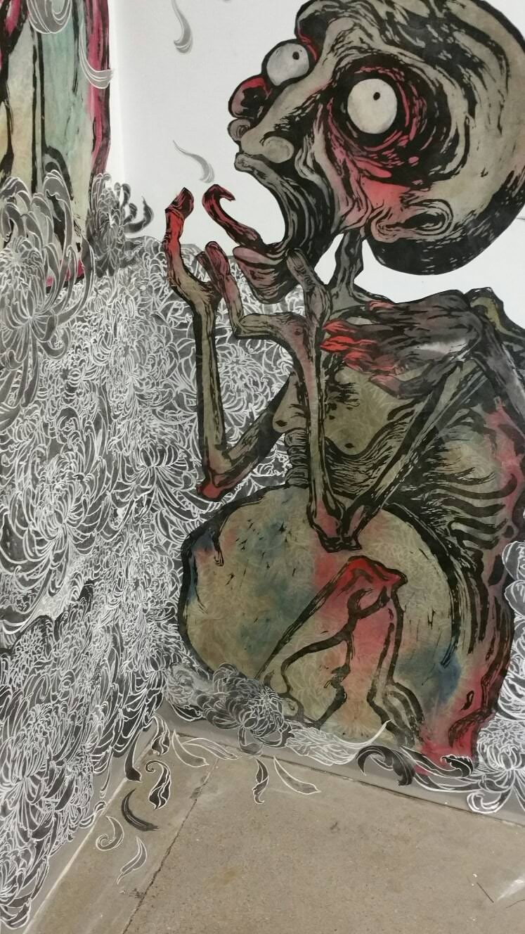 Here are photos of the various works by a PNCA‘s printmaking grad student Carrie Ann Kanani Miyamoto, who printed on washi and used wheat paste to “collé” directly to the wall: